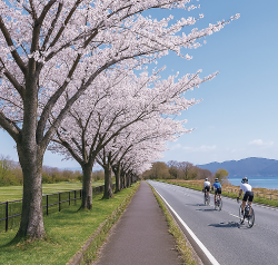 びわ湖西岸を彩る「風車街道」は、春になると約500本の桜が延々約6kmにわたり一斉に咲き誇り、見事な景観を描き出します。湖面に映る薄紅の花びらと、心地よい風にそよぐ桜並木は、訪れる人々に忘れられない春の情景を届けてくれます。